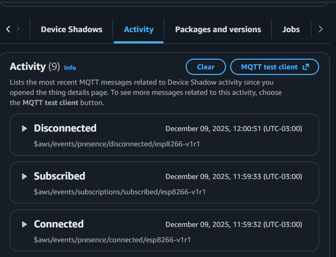 Selecionando o device podemos ver todas as atividades que ele executa: início da conexão, fim da conexão, assinatura de tópico, etc.