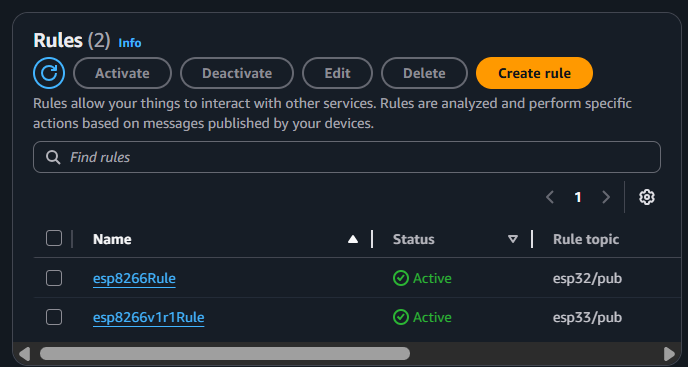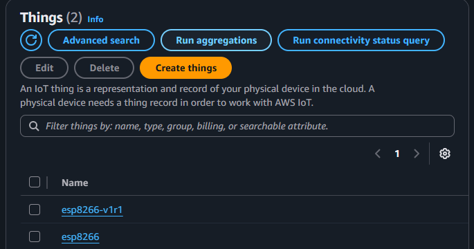 Dentro do painel AWS IoT Core podemos ver uma lista de devices cadastrados.