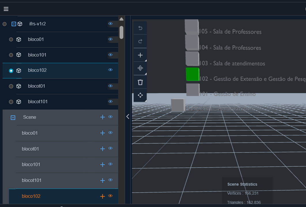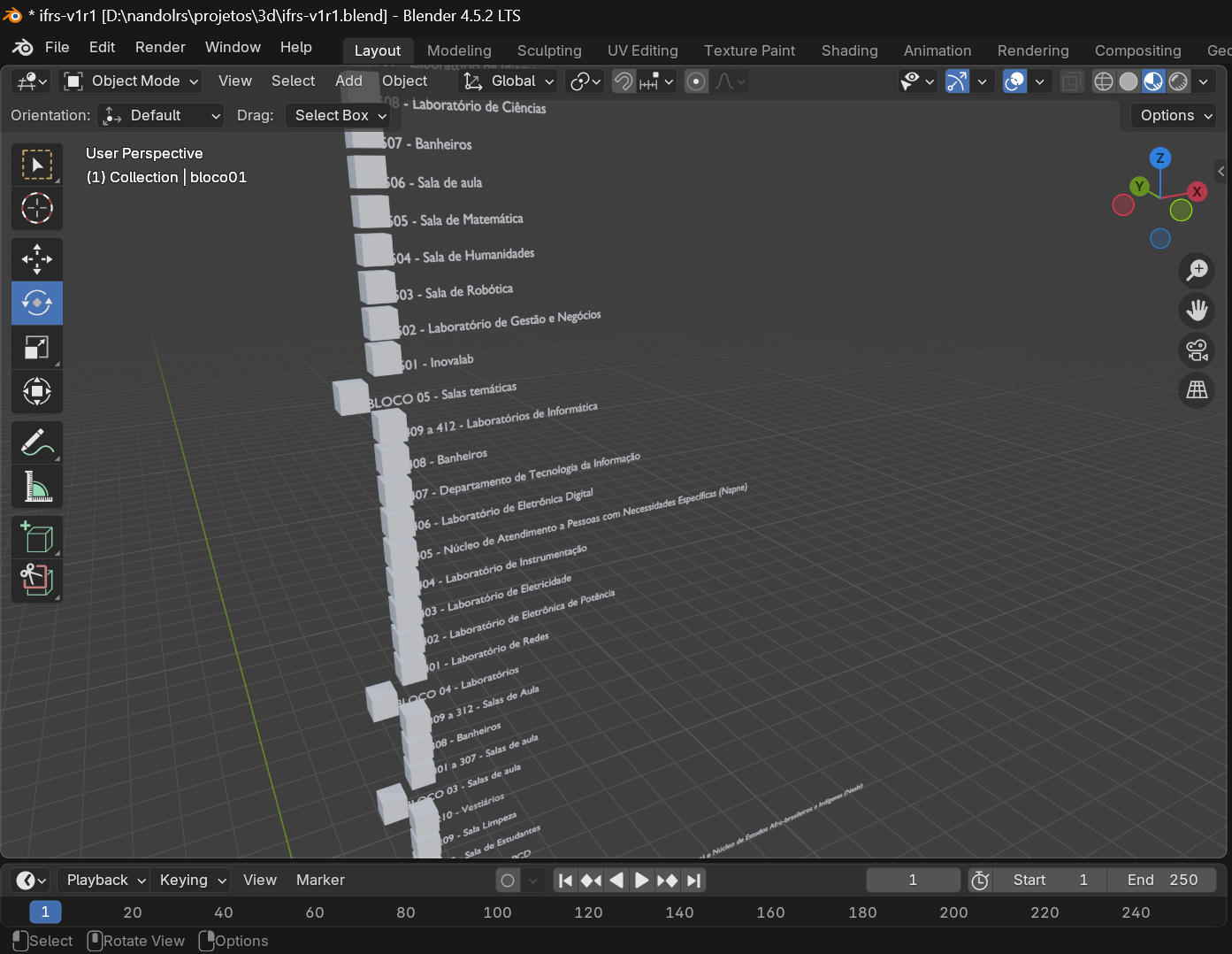 Para representar os dados em aspecto 3D foi modelada a estrutura do IFRS Restinga com seus blocos e níveis através do Blender .
