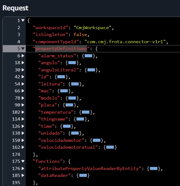 Em 'propertyDefinitions' temos uma lista de atributos, em 'componentTypeId' temos o nome do tipo de componente.